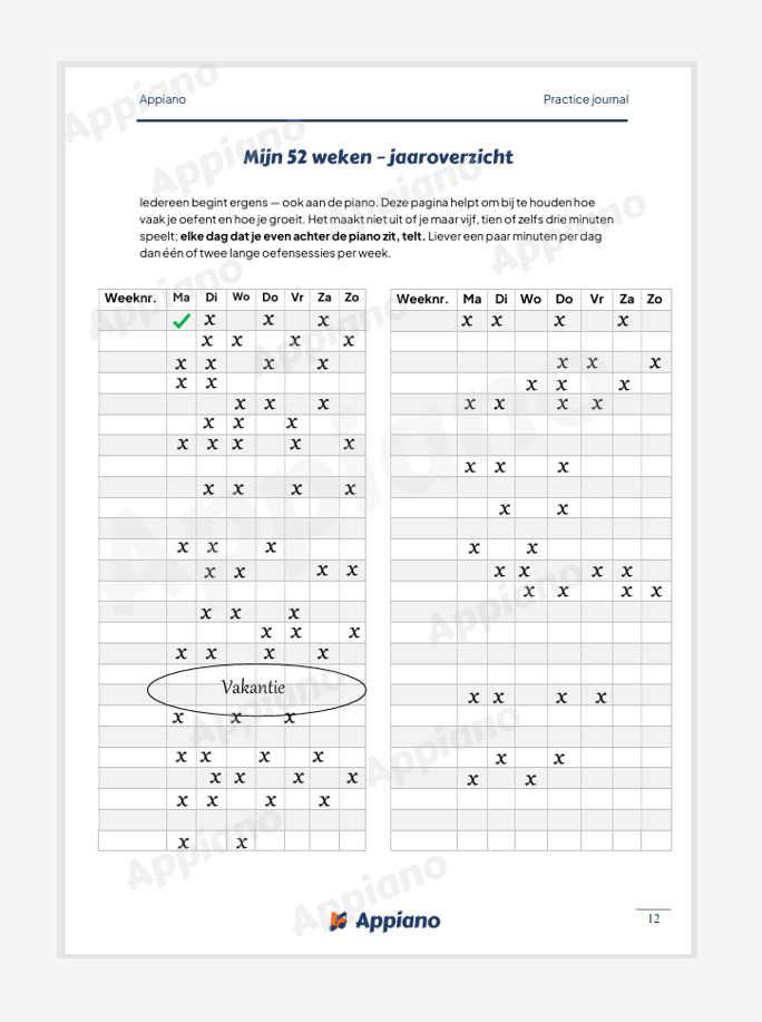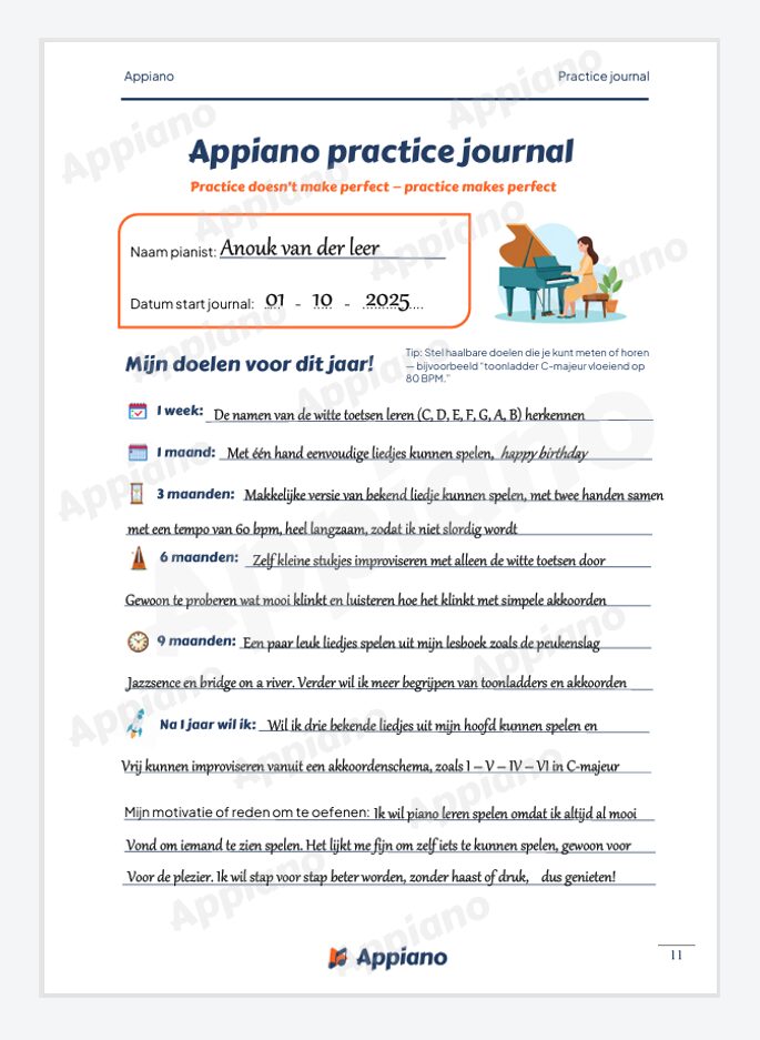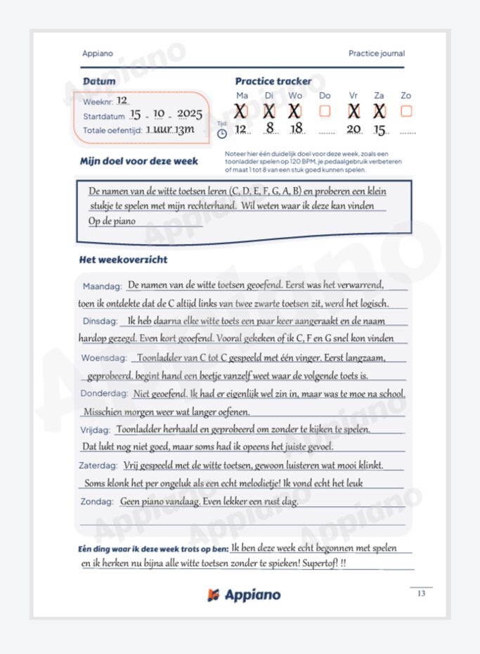 Met het Appiano Practice Journal maak je oefenen eenvoudig én leuk – en ontdek je hoeveel vooruitgang je in één jaar kunt boeken.