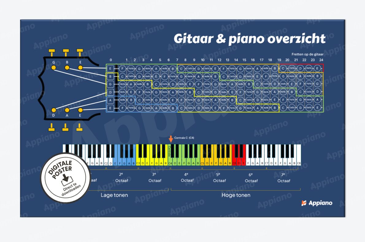 Bestel nu de digitale (HQ) printbare gitaar- & piano-overzichtsposter en ontdek in één blik hoe de noten op gitaar en piano met elkaar verbonden zijn – altijd binnen handbereik!