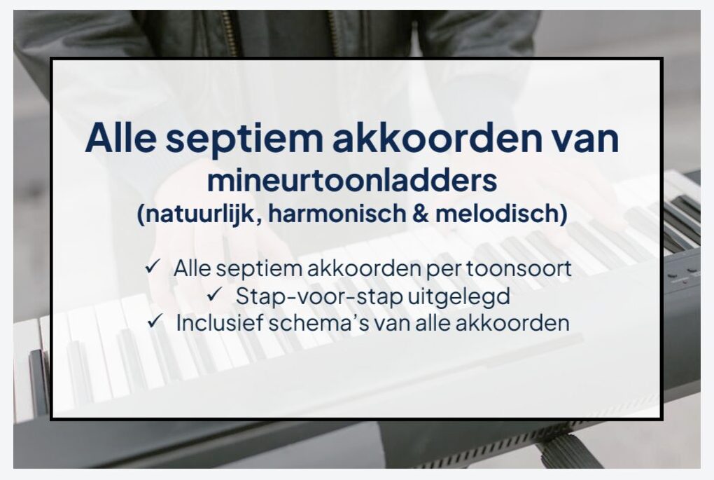 Leer alle septiem akkoorden die horen bij de natuurlijke, harmonische en melodische mineurtoonladders. Met duidelijke schema’s en stap-voor-stap uitleg zie je precies hoe septiem akkoorden per toonsoort zijn opgebouwd en speel je ze direct op de piano.